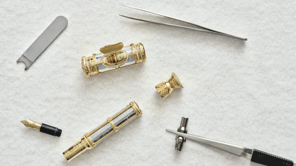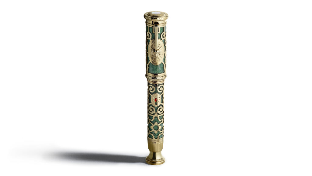 Conceived within Montblanc’s Artisan Atelier in Hamburg, each piece in this High Artistry collection is more than a pen — it is a microcosm of Versailles itself: its light, its architecture, its royal codes. Five unique editions pay homage to the palace’s timeless legacy, each one translating its gilded opulence and baroque details into sculpted gold, marble inlay, diamonds, and enamel.