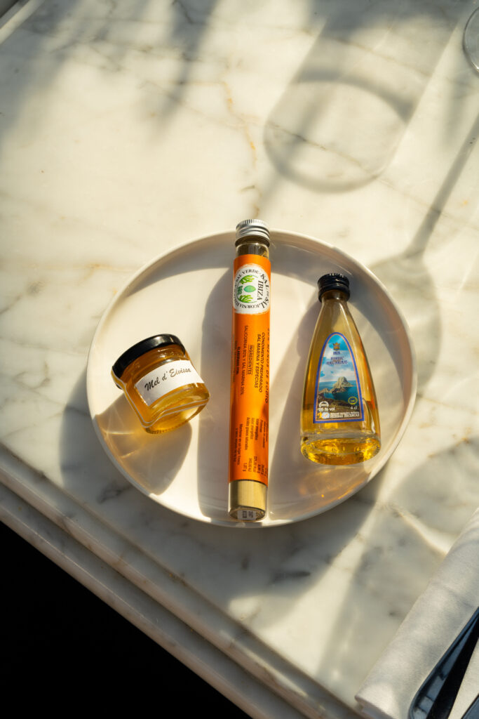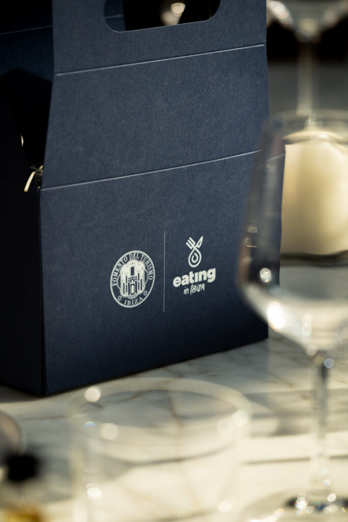 The evening extended beyond the table itself. Guests were offered a small box, discreetly marked with the project’s identity, containing a curated selection of Ibiza’s local treasures: salt from Bibopark, honey from the island’s beekeepers’ association, and a sample of Hierbas Ibicencas by Mari Mayans.