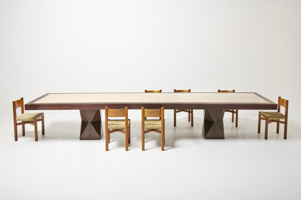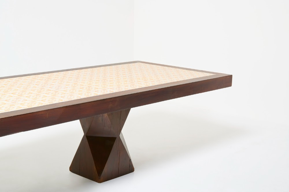 The piece – a monumental dining table from 1978 – will be revealed to the public for the very first time. Long held in a private residence in Ibirapuã, Brazil, it represents a rare and decisive moment within Caldas’s oeuvre, combining his iconic mastery of solid wood with an almost unheard-of use of ceramic tiles. This unexpected dialogue between materials lends the work a singular formal tension, positioning it well beyond conventional classifications of furniture or sculpture.