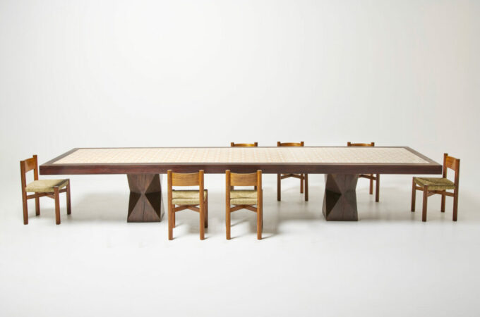 The piece – a monumental dining table from 1978 – will be revealed to the public for the very first time. Long held in a private residence in Ibirapuã, Brazil, it represents a rare and decisive moment within Caldas’s oeuvre, combining his iconic mastery of solid wood with an almost unheard-of use of ceramic tiles. This unexpected dialogue between materials lends the work a singular formal tension, positioning it well beyond conventional classifications of furniture or sculpture.