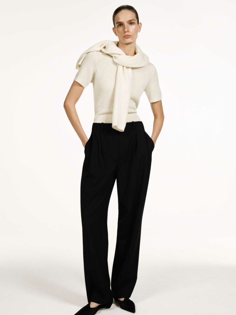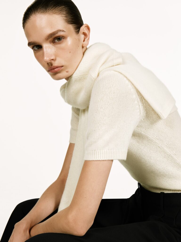 The silhouettes are pure COS – clean, modern, and quietly sophisticated. Relaxed knits, elegant short-sleeved sweaters and fluid layering pieces appear in a palette of soft neutrals that feel calm and timeless.