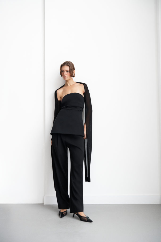 This season, uplifting, airy volumes and delicately layered transparent fabrics meet soft, sculptural lines, blending elegant draping with tailored precision. Billowing off-the-shoulder tops and wide-leg trousers cocoon the wearer crafting a dynamic, voluminous visual that exudes confidence. Traditionally laid-back styles are reinvented in mesh fabrics that cascade around the body, while classic tailoring crafted from smooth silk takes on a loose unstructured silhouette.