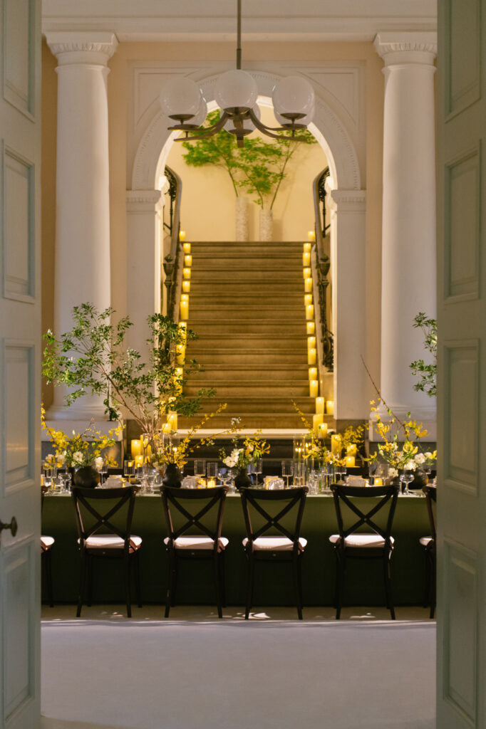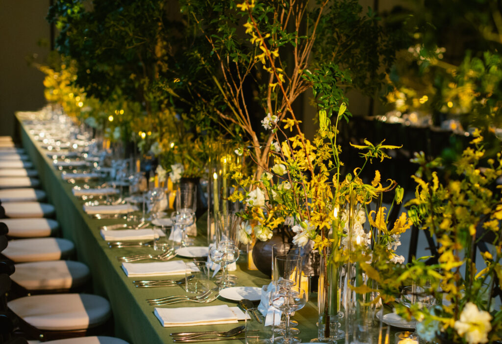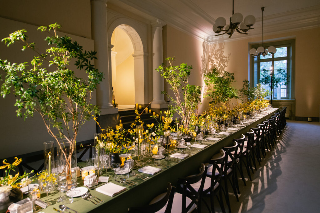 The setting reflected this philosophy with quiet authority. Tables dressed in linen, candlelight diffused across the space, and floral compositions that felt more like gestures than decoration. Daffodils, wild blossoms, lily of the valley – arranged with a sense of balance that echoed the refined minimalism of Japanese aesthetics.