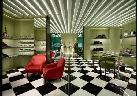 Expansive video walls, green ceiling beams, floors laid with yellow and white geometric patterns and green Alpine marble accents enhance furnishings and spaces. The ground floor is dedicated to leathergoods, accessories and women’s footwear. The first floor is exclusive to women’s collections and offers very intimate spaces for Made to Order services. The second floor, dedicated to the men’s collections and Made to Measure, is characterized by more masculine colors, furnishings and geometric elements.
