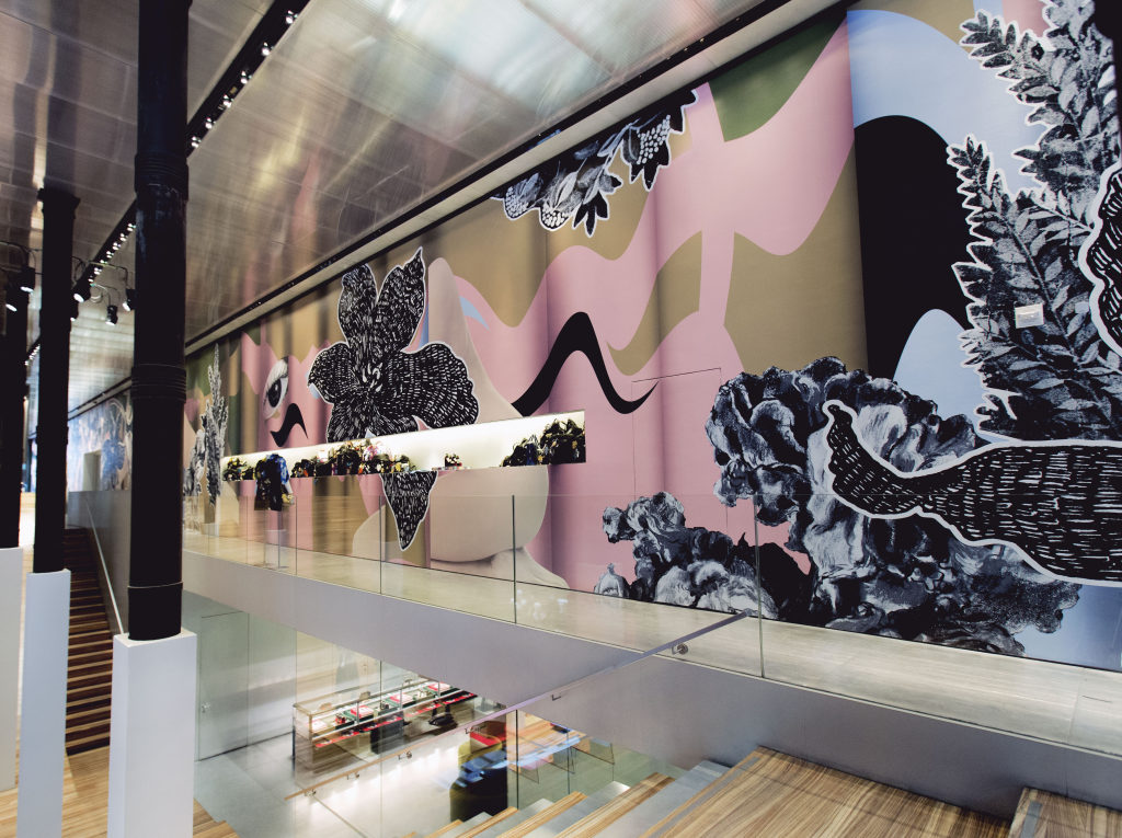 The PradaVision installation, wallpaper, and video content was designed by Prada in collaboration with 2×4 New York City.