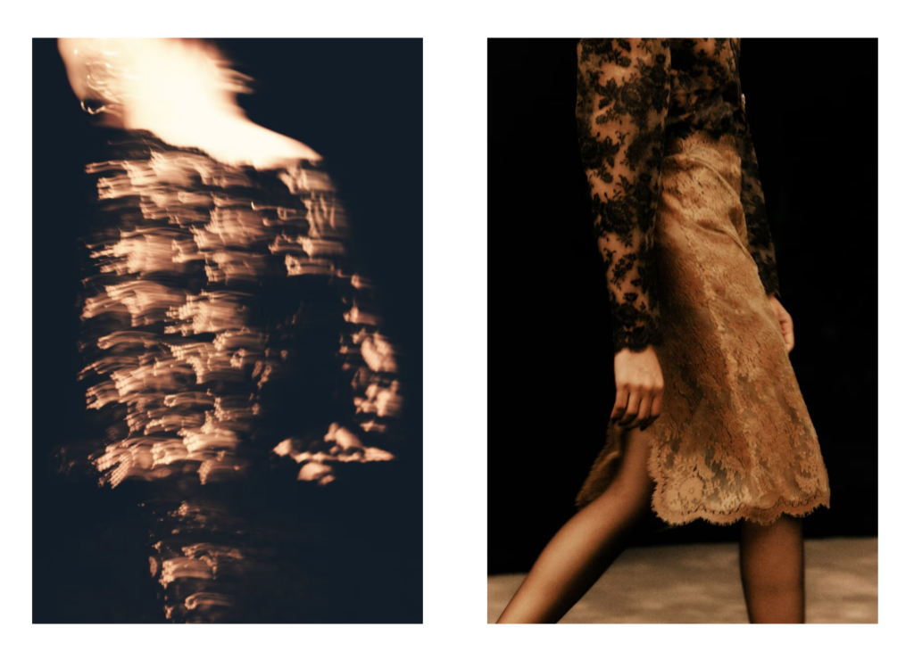 Delicate black lace silhouettes floated down the runway like shadows, sculpted close to the body yet ethereal in movement. Slip dresses, translucent textures and liquid fabrics blurred the line between strength and vulnerability.