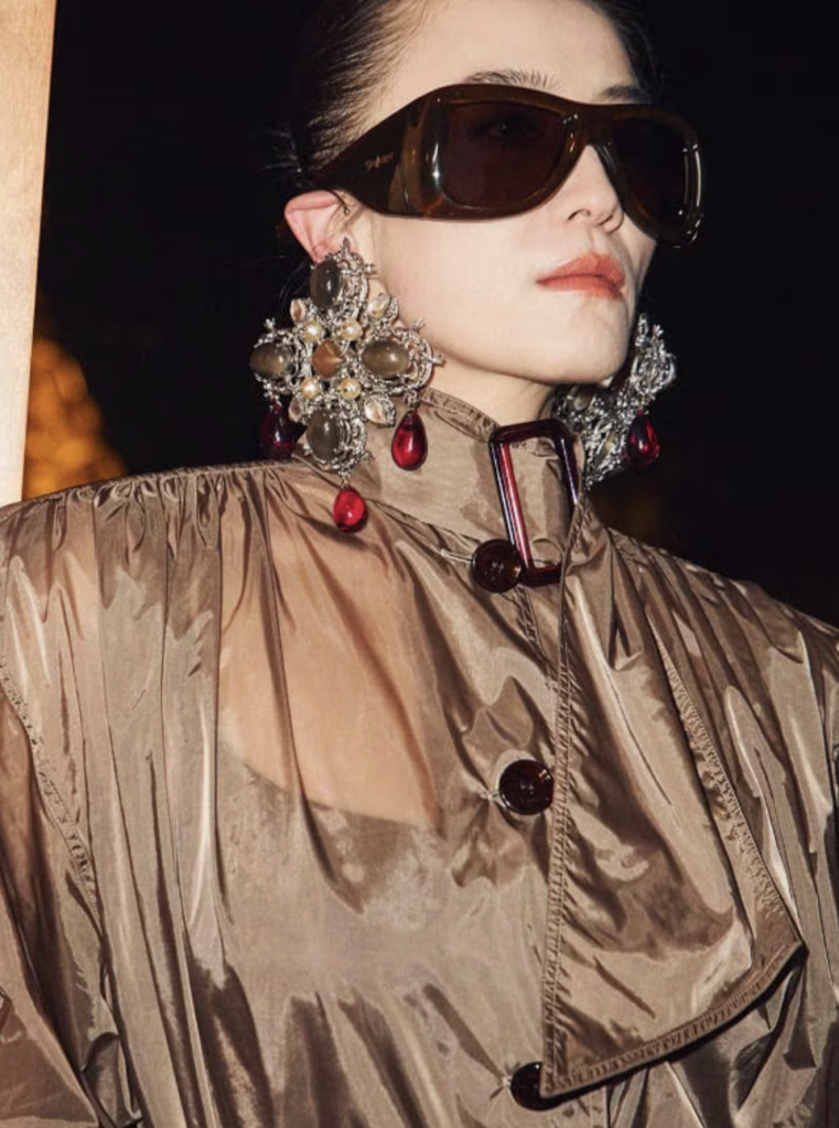 The palette deepened the drama: midnight black, tobacco brown, deep burgundy and rich neutrals. Fur accents, sculptural earrings and glossy textures added a decadent Parisian intensity.