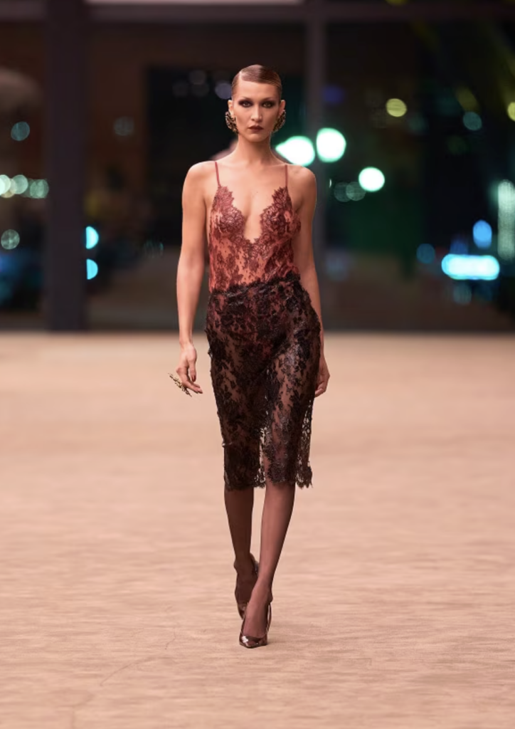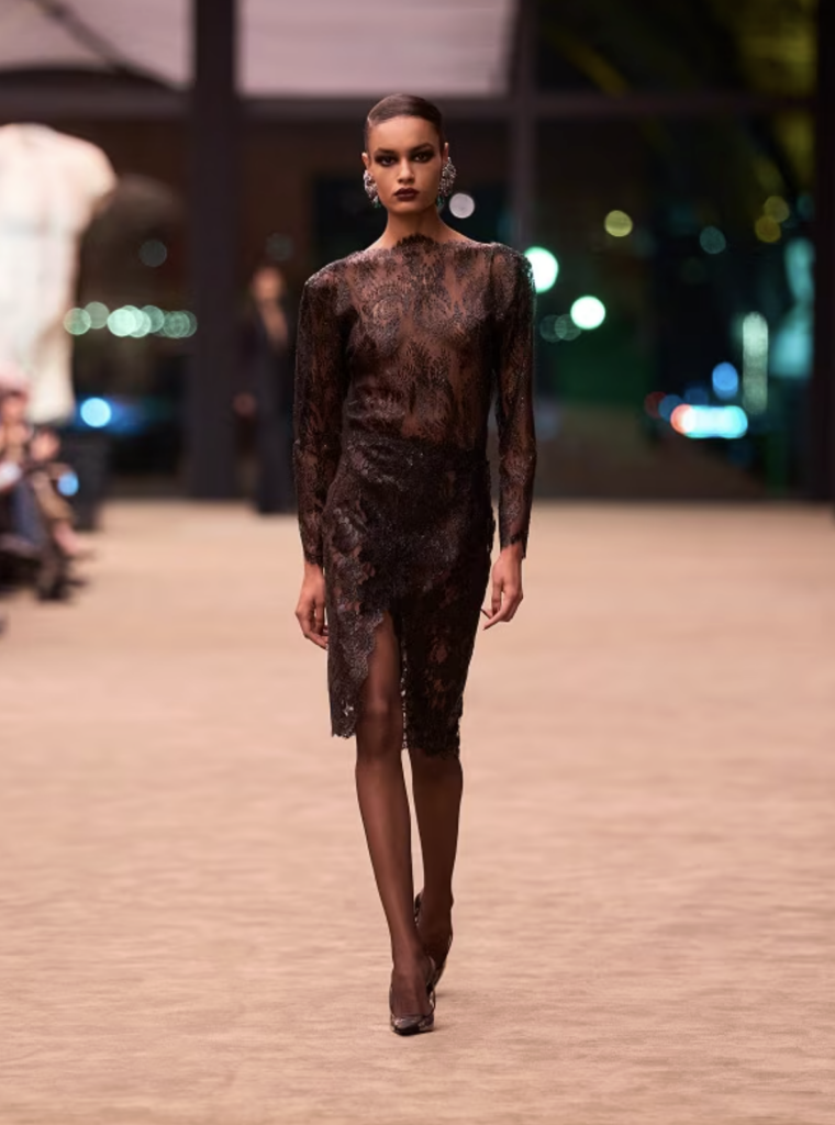Just as the collection seemed to lean into sharp discipline, Vaccarello introduced a striking contrast – sheer lace dresses that revealed the body beneath with hypnotic elegance.