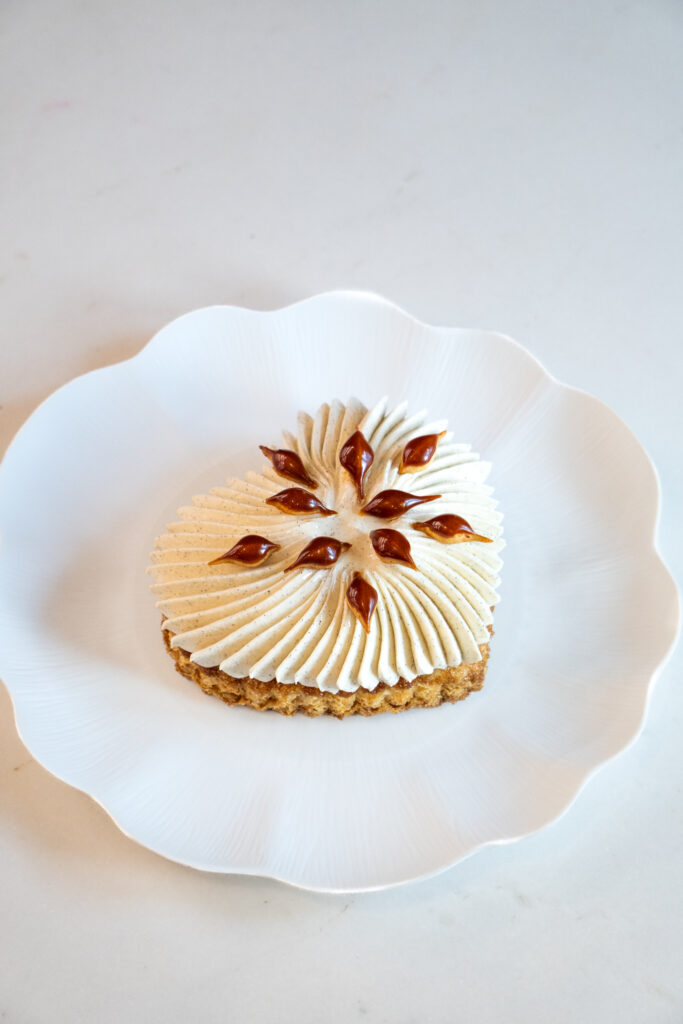 Sweetness continues beyond the table thanks to pastry chef Maxence Barbot, who unveils two exclusive creations for the occasion. The Saint-Honoré d’Amour, reimagined in the shape of a heart, and the Vanilla & Pecan Flan d’Amour, adorned with a personalized golden heart, transform dessert into a true declaration. These creations are available at L’Épicerie des Ateliers du Bristol, perfect for extending the magic beyond the evening.