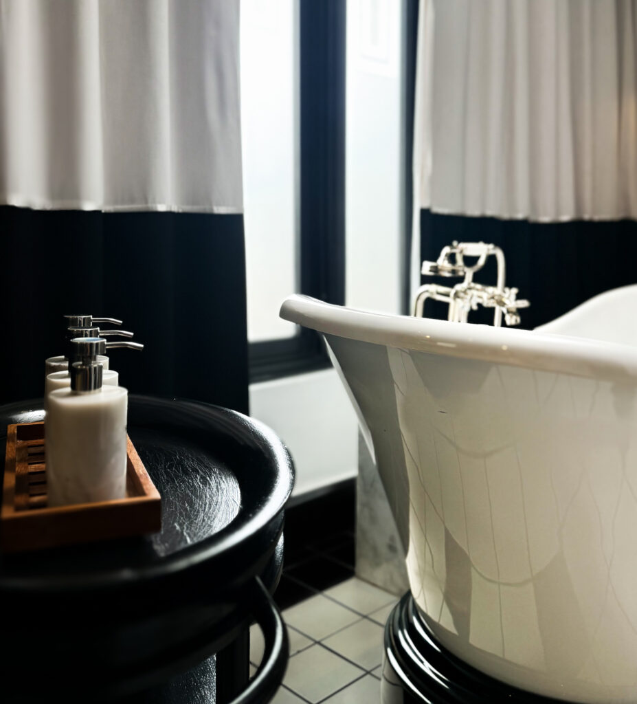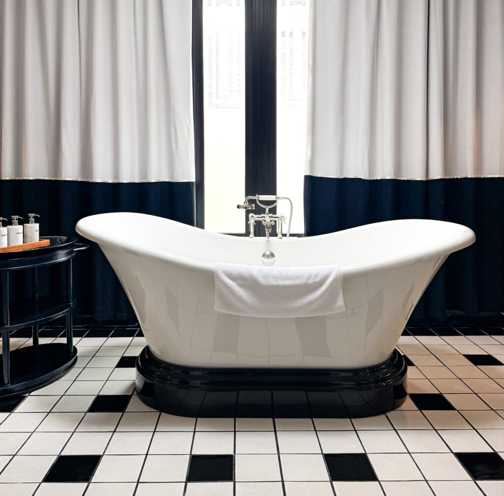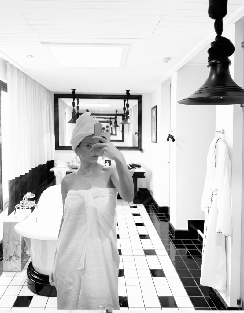 Our suite was cinematic without trying to be dramatic. High ceilings. Monochrome photography. Cool marble against dark wood. Everything composed, nothing loud.